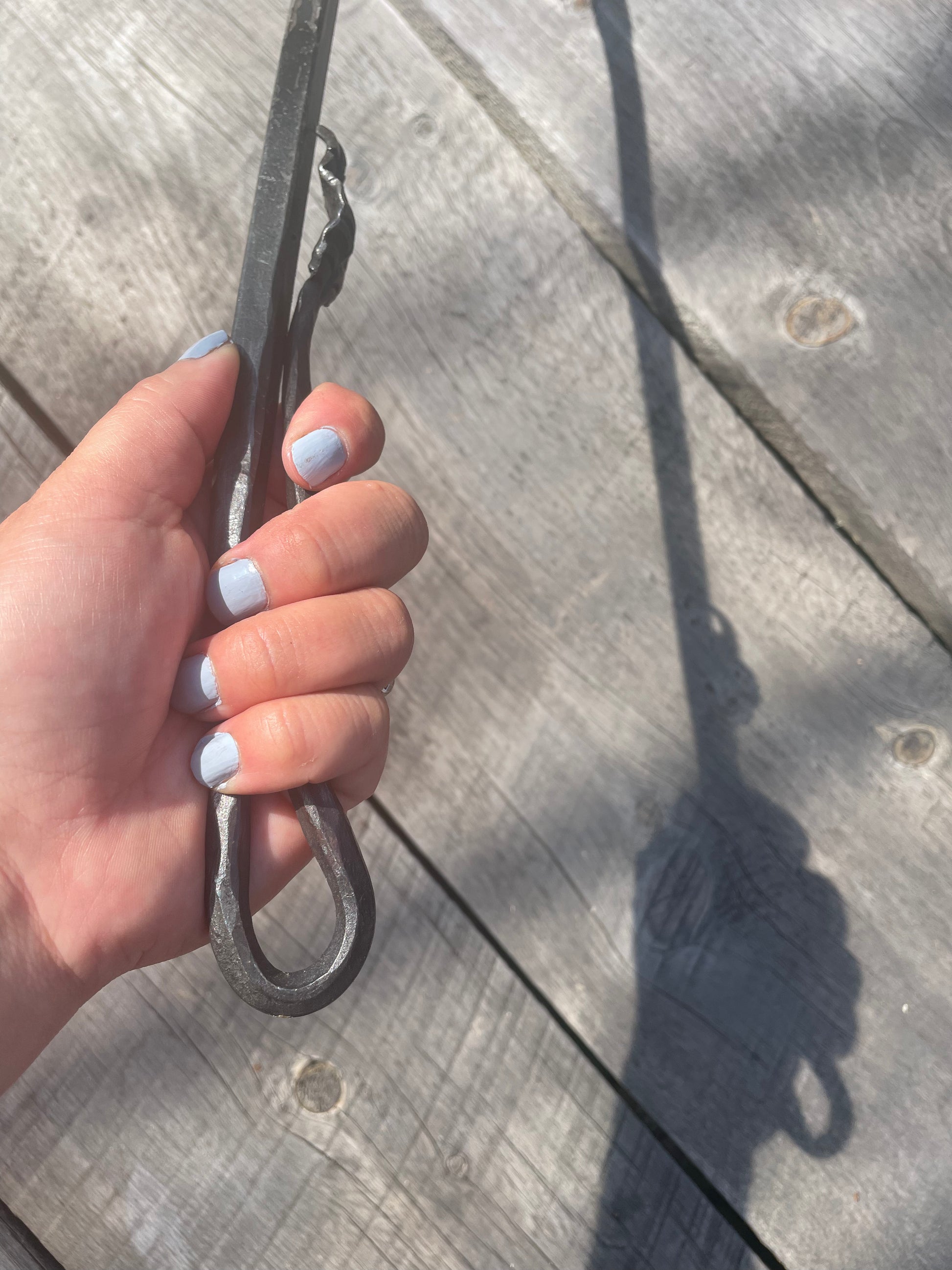 One of our more ornamental pokers with a gothic leaf accenting the handle and decorative twists. It is of a medium length ideal for bon fires and/or for use in a sauna or wood stove.