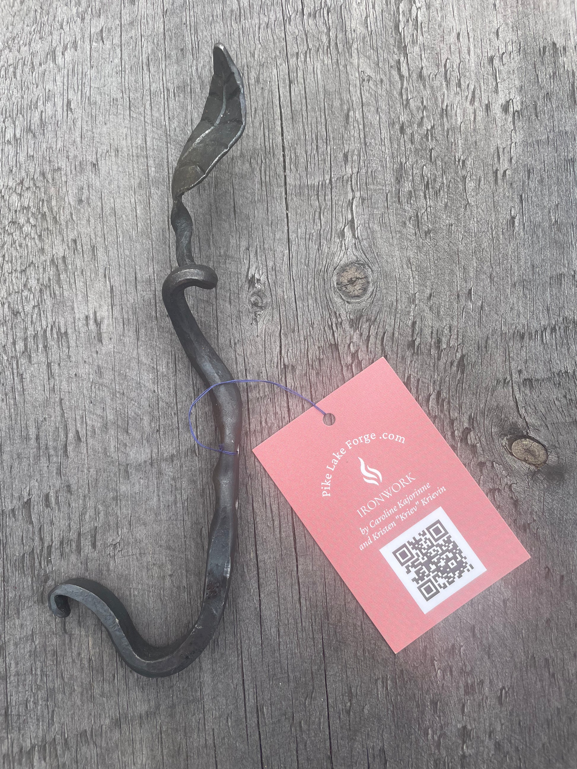 Carol uses a Power Hammer to forge this broad, thin style of leaf, which she learnt from Dave Hanson of Lake Superior Metalsmiths. Forged from mild steel, wall hooks are ideal for hanging keys, oven mitts, a housecoat or your favourite purse. Accented with a cold chased leaf at the top, akin to birch or poplar, the hook has two recessed holes for mounting, ensuring it does not rotate. While warm, the hook is dipped in vegetable oil, washed and then sprayed with a clear lacquer to ensure it's corrosion resistant.