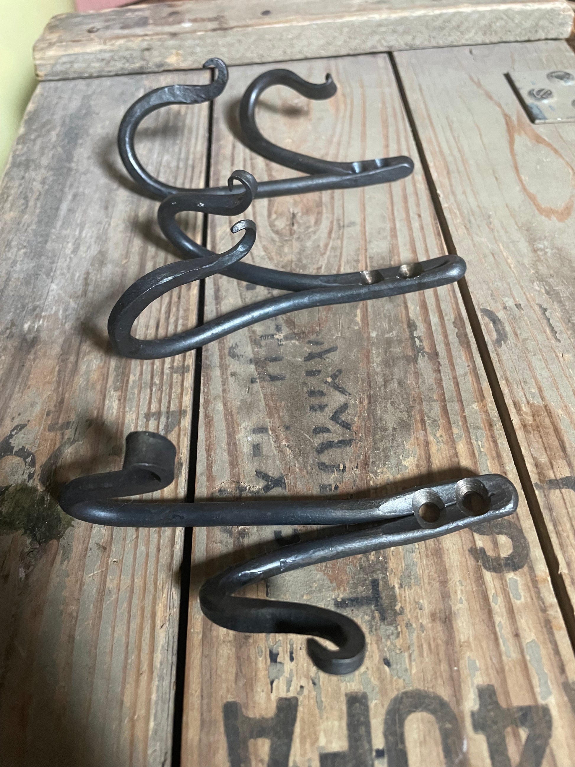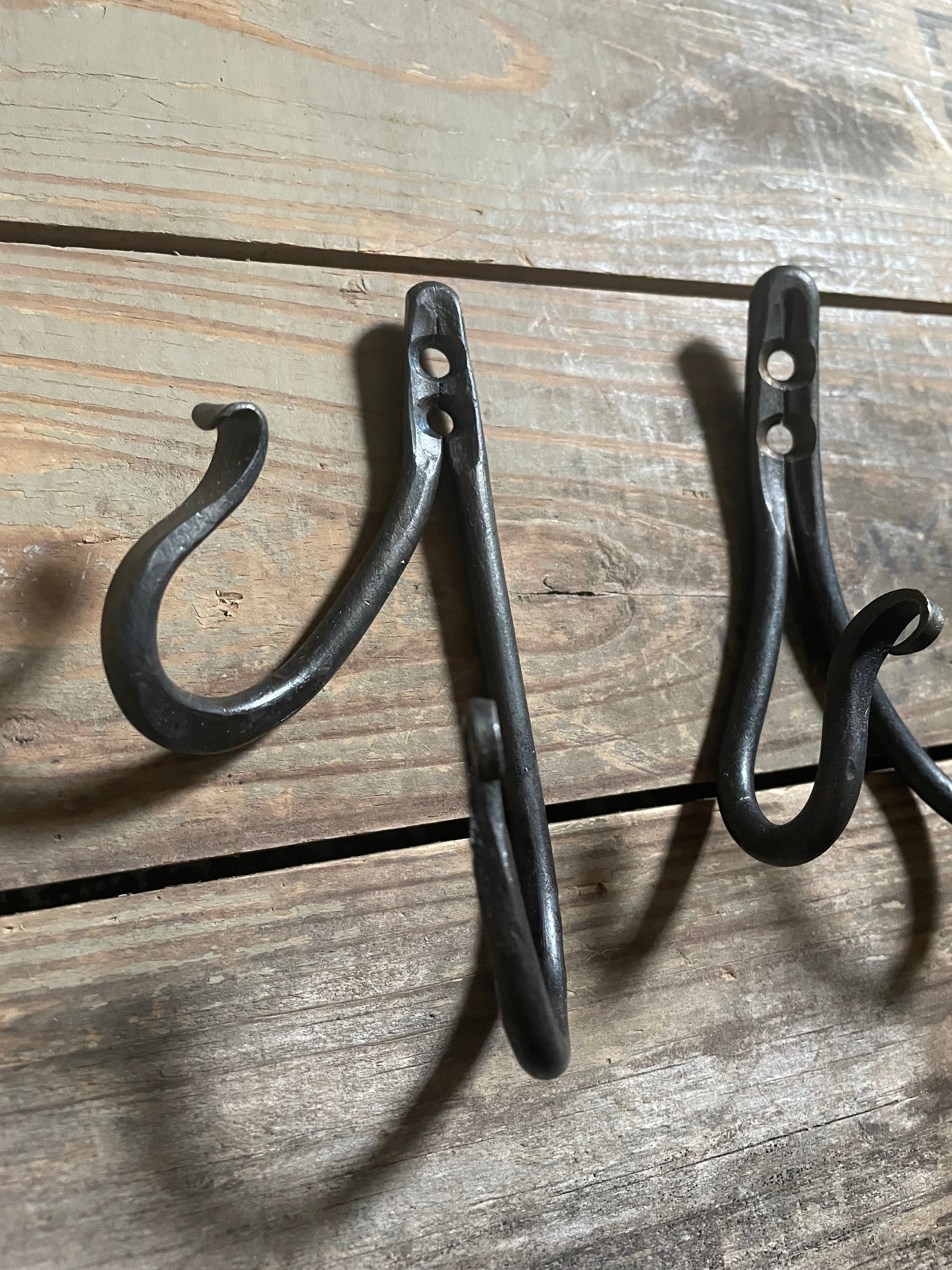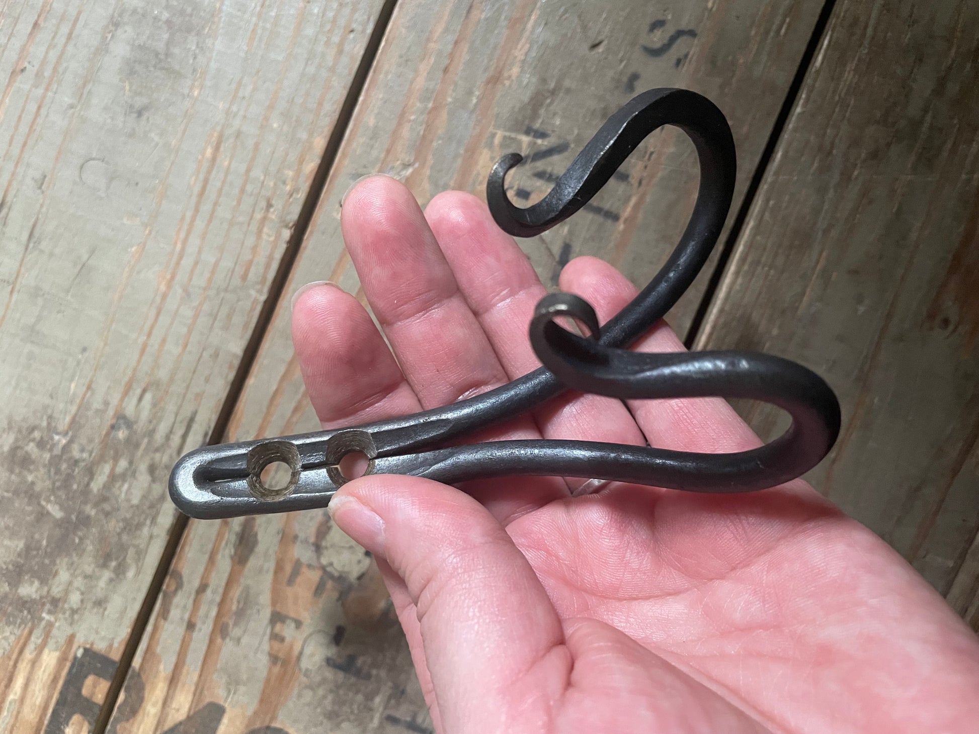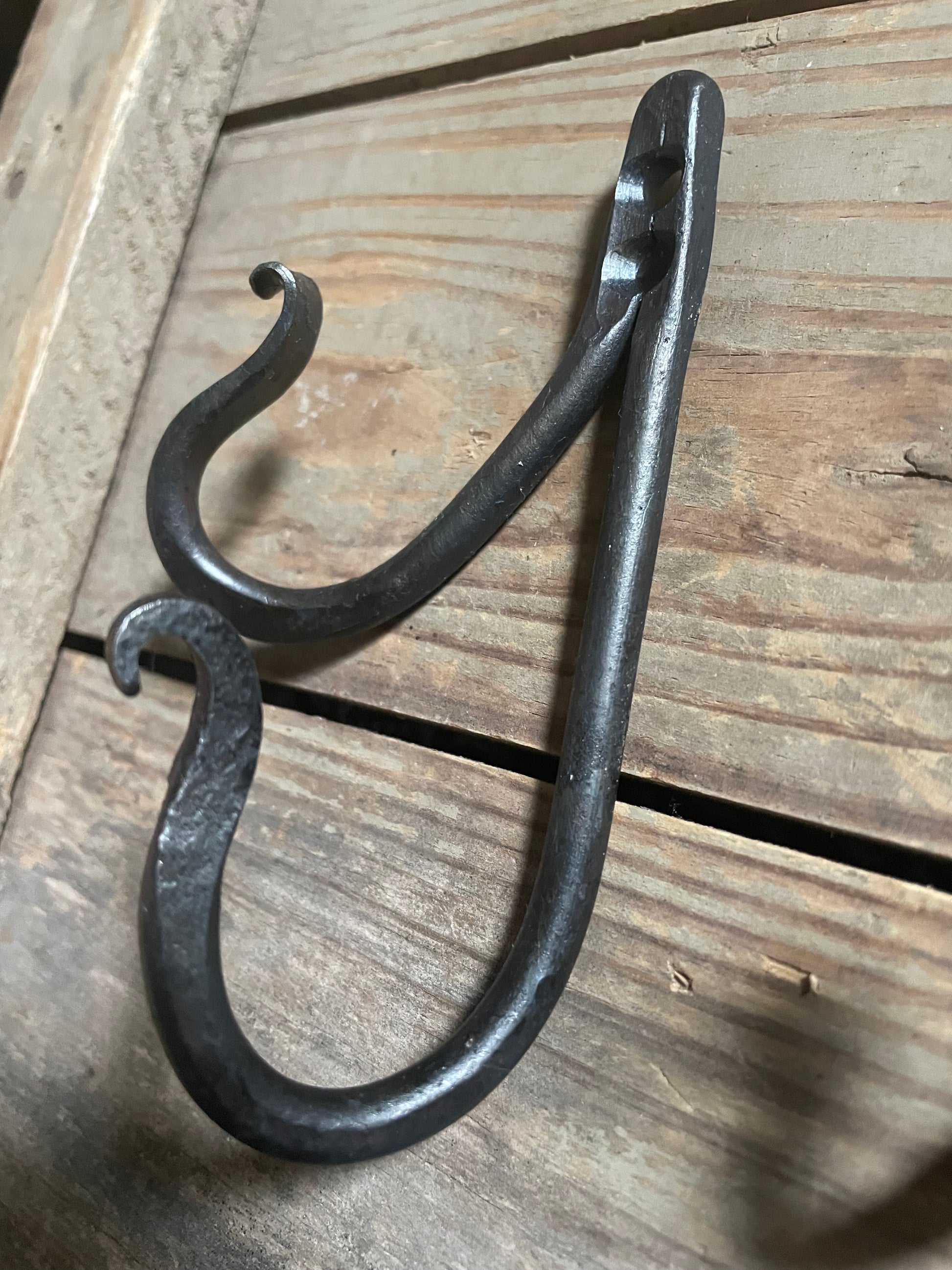 Forged by Carol, these hooks are smaller, made of 1/4" parent stock.  No two are the same. Varying in length, of around 5 inches, each hook end is unique offering a whimsical feel intended to accent their handmade quality.  They have two countersunk holes, ensuring the hook does not pivot.