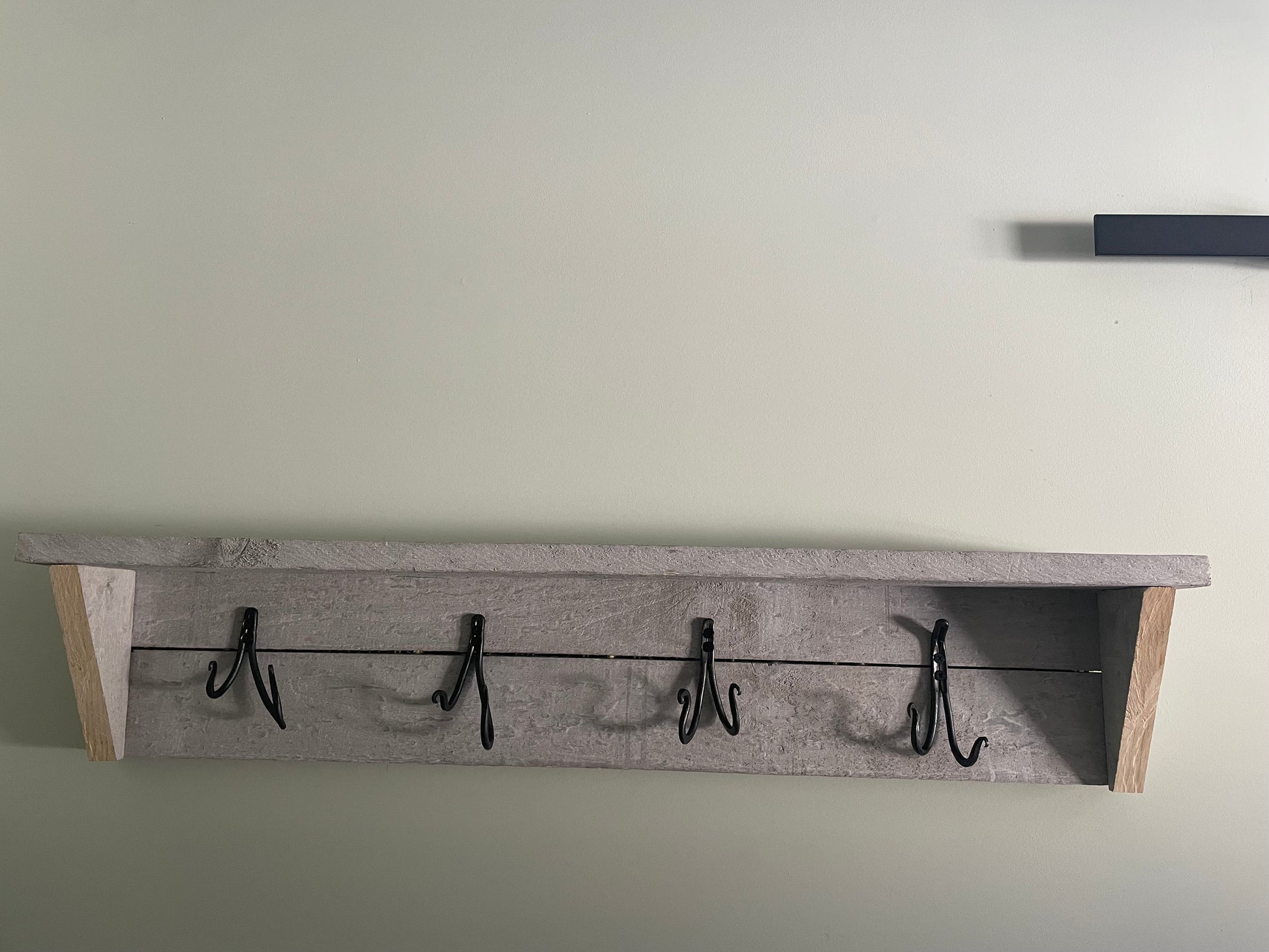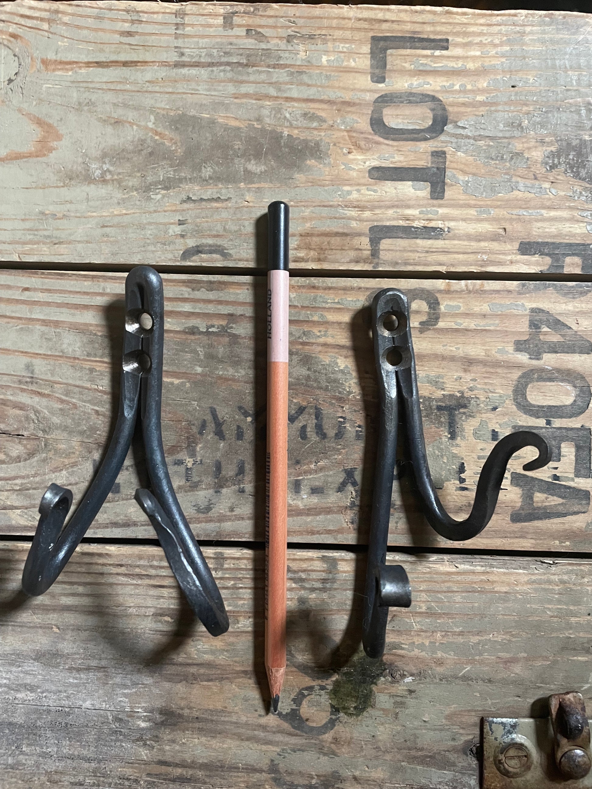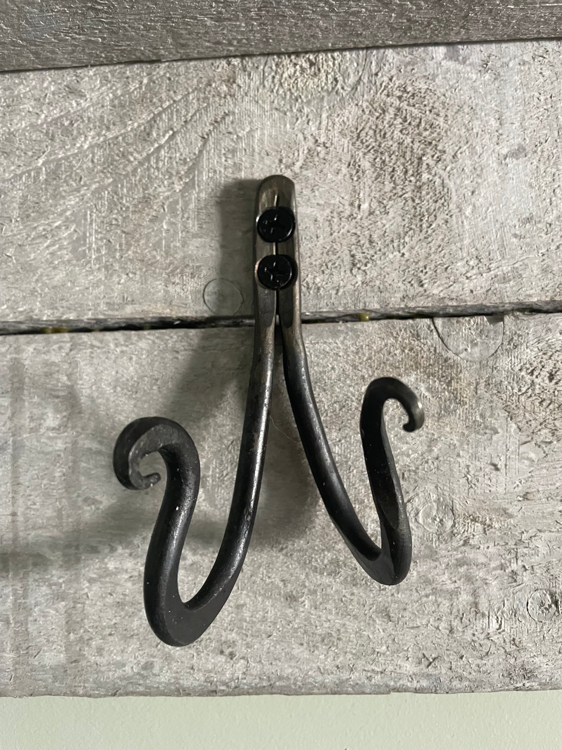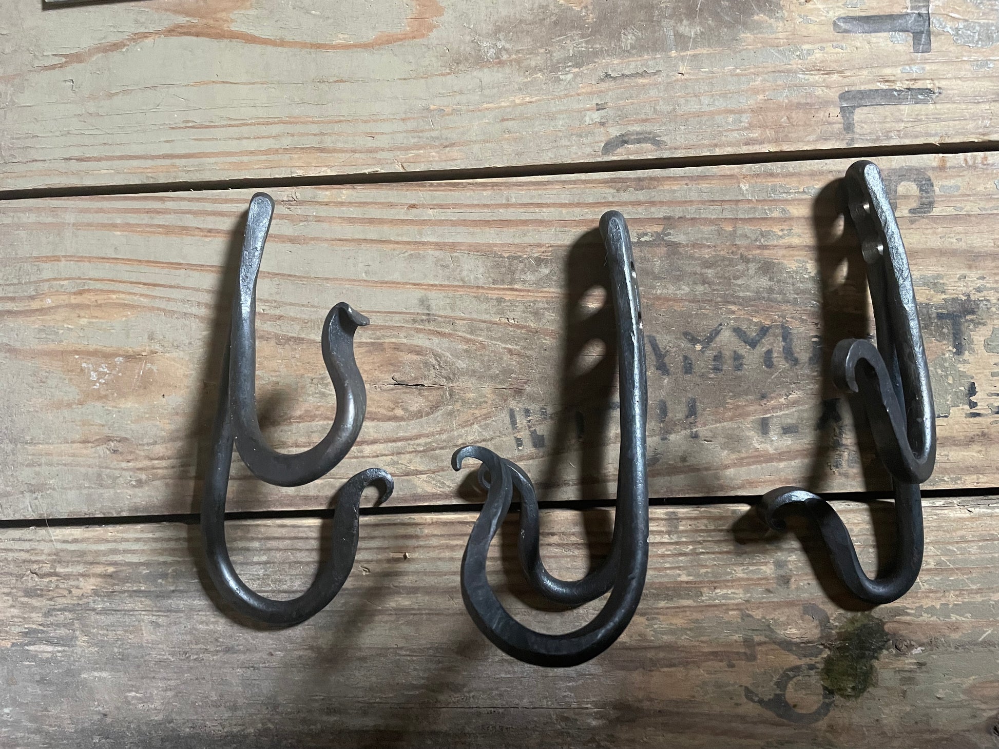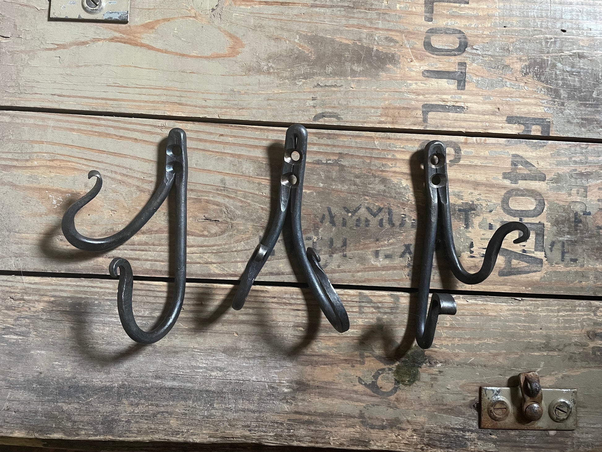 Forged by Carol, these hooks are smaller, made of 1/4" parent stock.  No two are the same. Varying in length, of around 5 inches, each hook end is unique offering a whimsical feel intended to accent their handmade quality.  They have two countersunk holes, ensuring the hook does not pivot.
